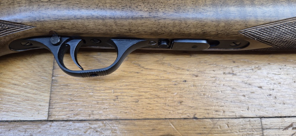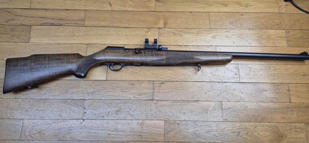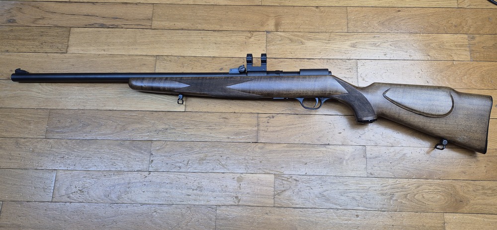 Armes longues de catégorie BPeu courante et originale Carabine Beretta modèle Olimpia – Calibre .22LR – Deux modes: répétition manuelle et semi auto – chargeur 5 coups – Carabine lourde orientée vers la précision plus que le loisir – Bois de noyer de qualité et mécanique en TBE++ – Bronzage à 99.99% – Arme de 1980 – Finitions et matériaux de très grandes qualité – Canon neuf avec de superbe rayures – Bloc collier acier pour lunette – Qualité Berettta des grandes années de partout! – TBE+++