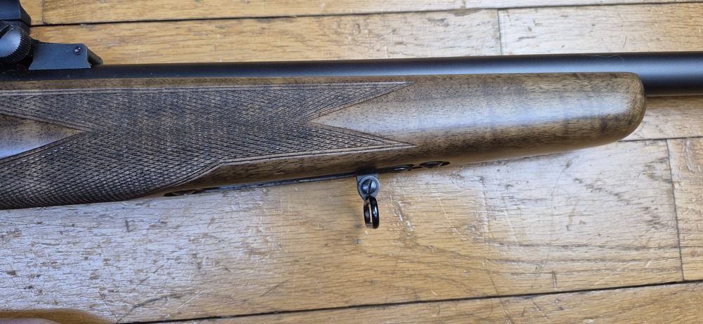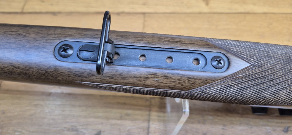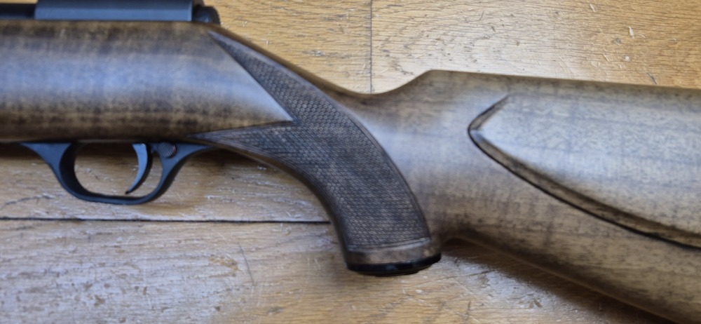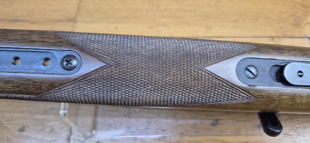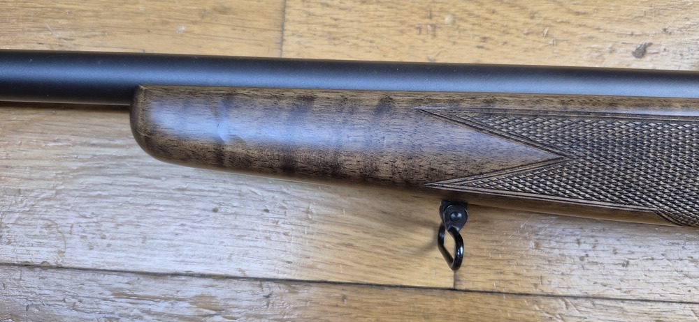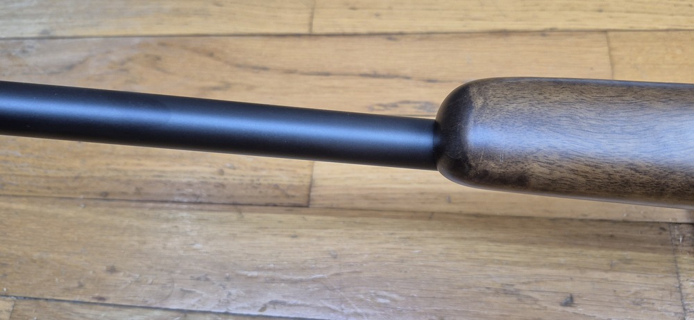 La monture de bois est volontairement alourdie, avec poignée pistolet, joue gauche et profil de type Monte Carlo. C’est clairement une ergonomie pensée pour la stabilité au tir.