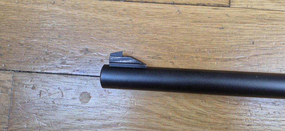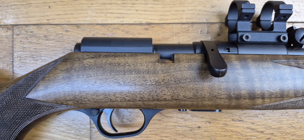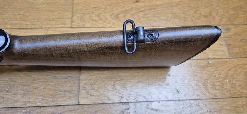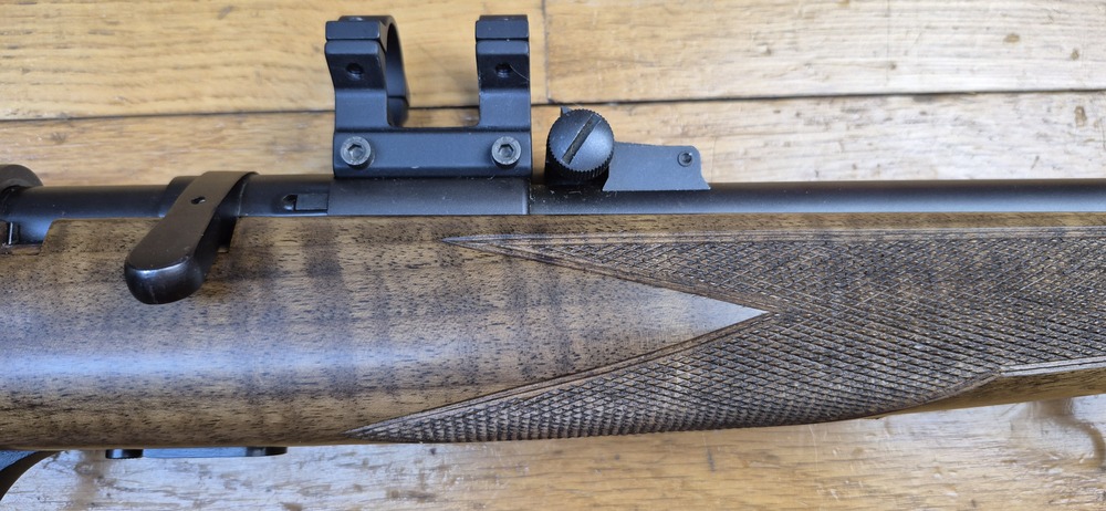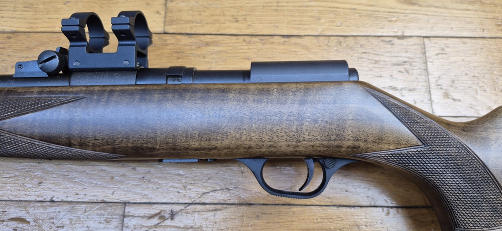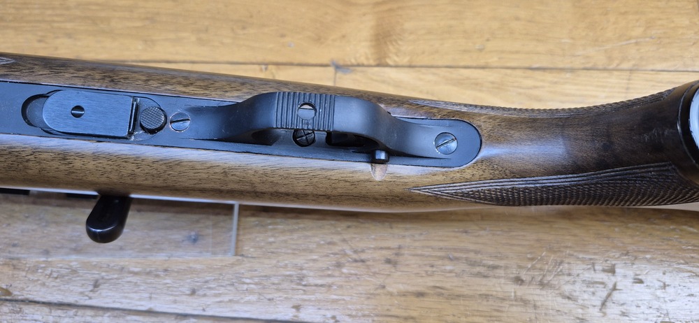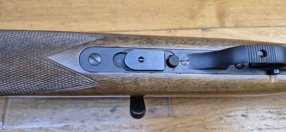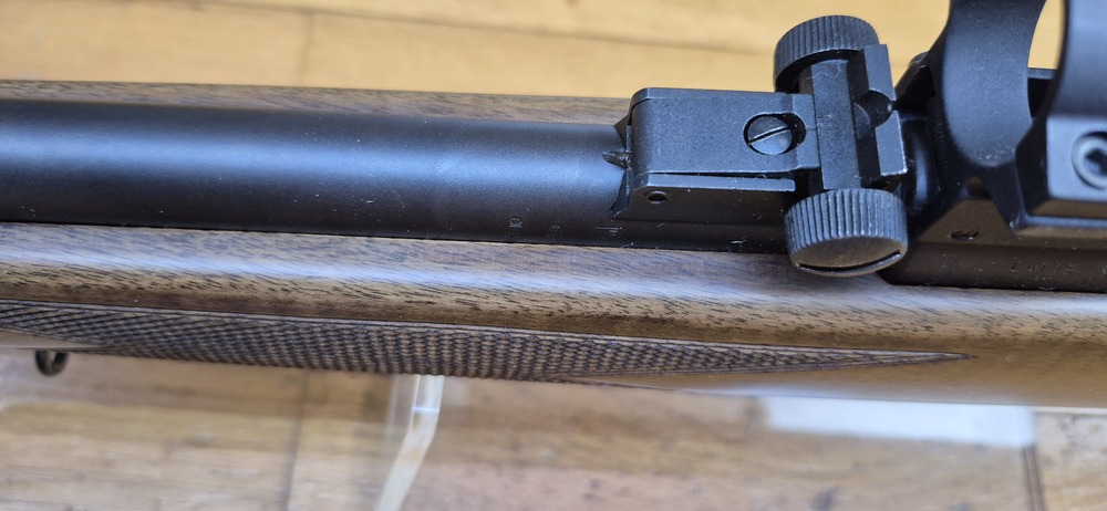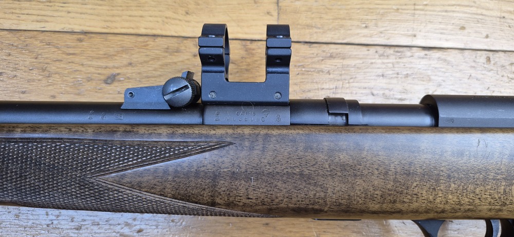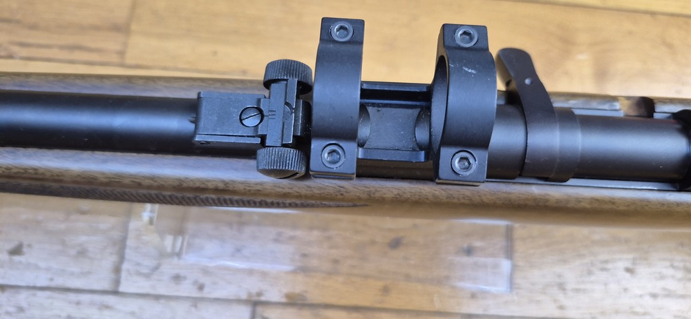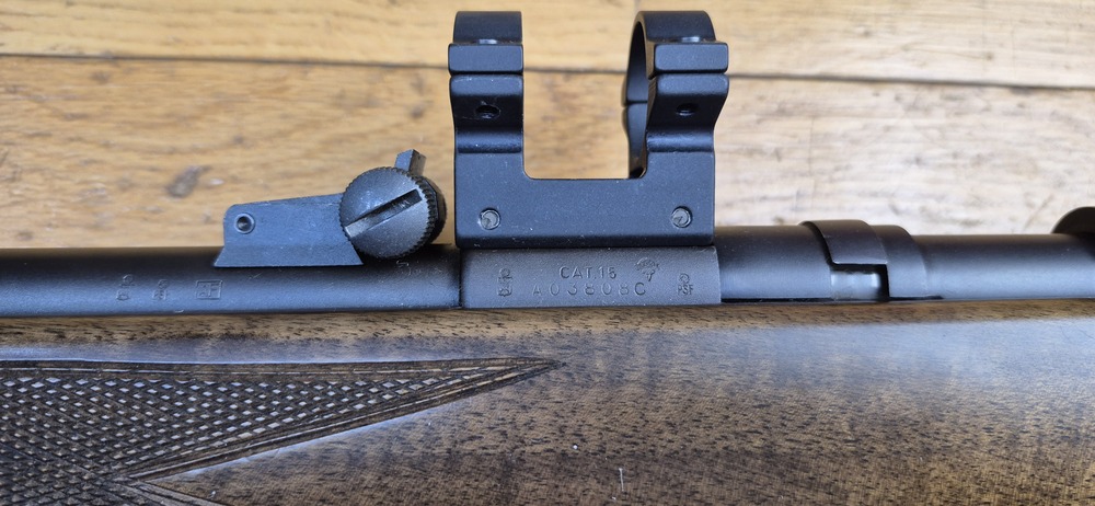 Small Arms Review signale en outre que la zone arrière de l’arme se prêtait bien au montage d’un dioptre ou d’accessoires de tir plus spécialisés. Certains exemplaires ont effectivement été équipés de systèmes de visée de compétition.La notre est montée avec deux collets acier pour monter une lunette. On peut bien évidemment les ôter par clé Allen pour revenir à la hausse qui est place et parfait état.