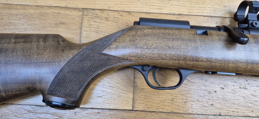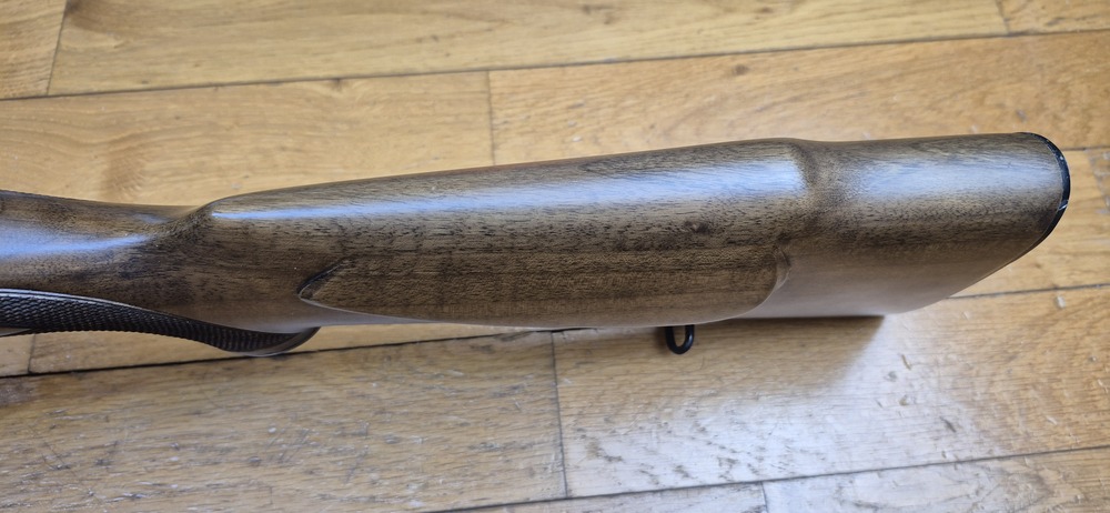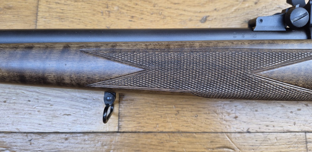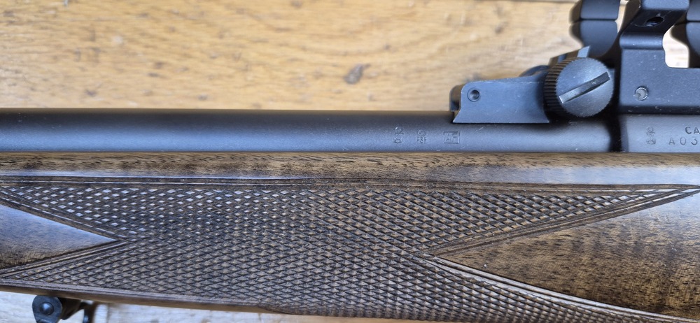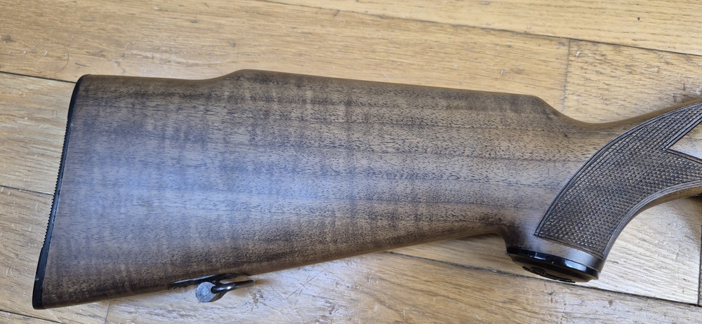 Ils sont d’abord superbe dans un noyer zébré de grain très fin de qualité supérieure sur notre exemplaire – Très beau quadrillage de préhension aussi. Elle ne risque pas de vous échapper alors que le reste de l’arme est au contraire très soyeux. Très beau bois quasiment sans marque – Arme quasi neuve encore une fois – TBE+++