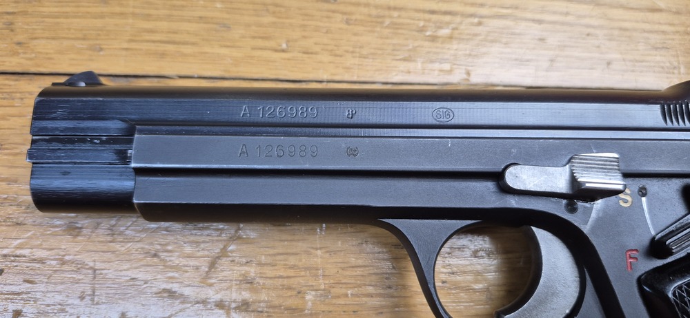 - toutes les armes militaires suisses, elles, sont en numéros de série en A sur la carcasse de A 100001 à A 213110 (avec ou sans un « P » sur le pontet selon qu’ils aient été ou non conservées par leur titulaire revenu à la vie civile)