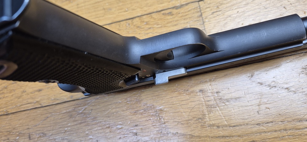 Cette belle finition sombre, en deux teintes légèrement différentes de phosphatage comme toujours, associée aux plaquettes noires et à son anneau de dragonne en poignée lui donne un aspect martial des plus seyants en plus.