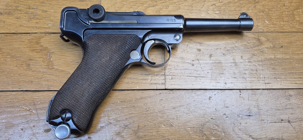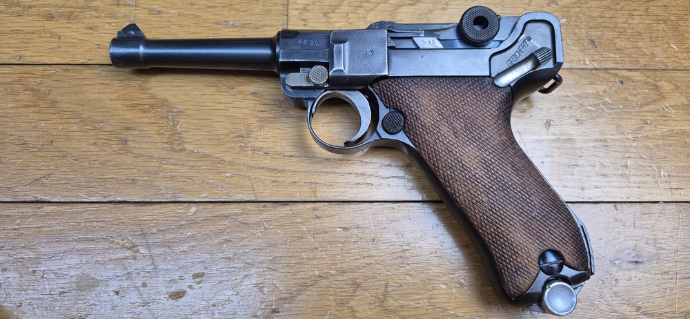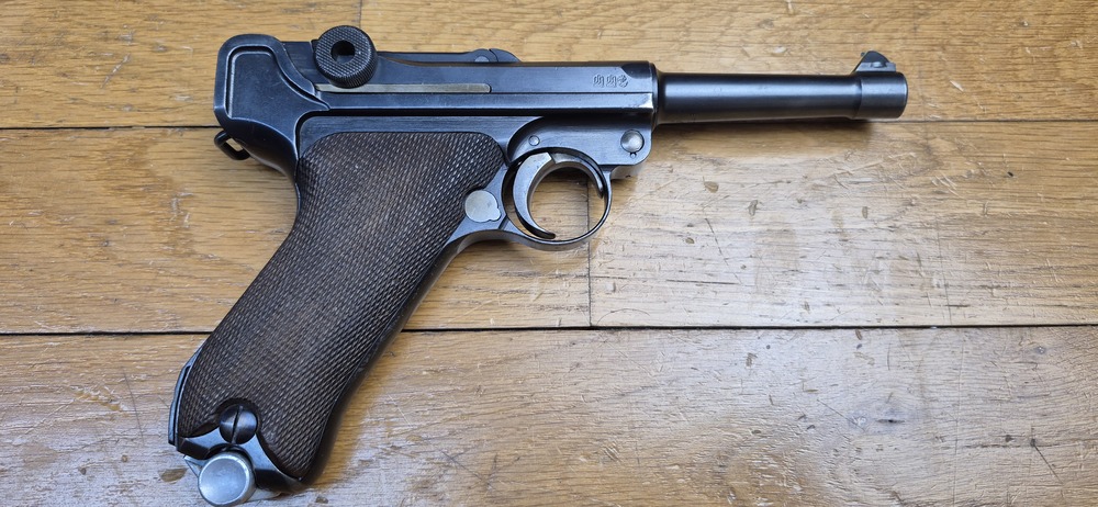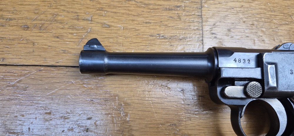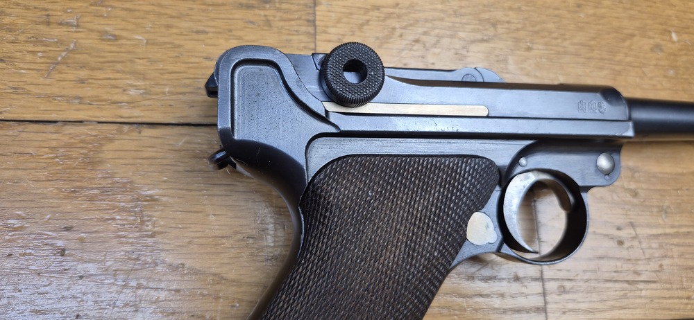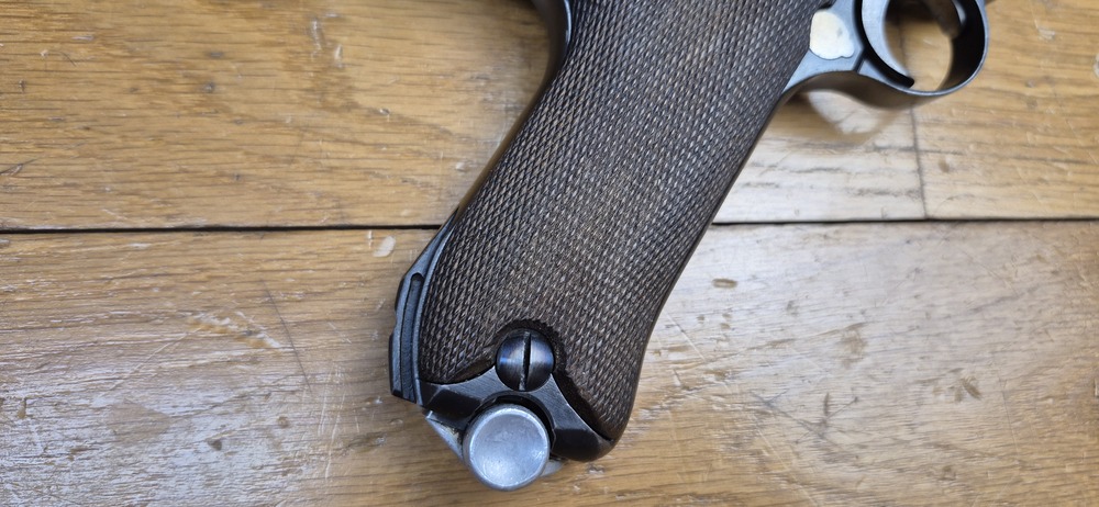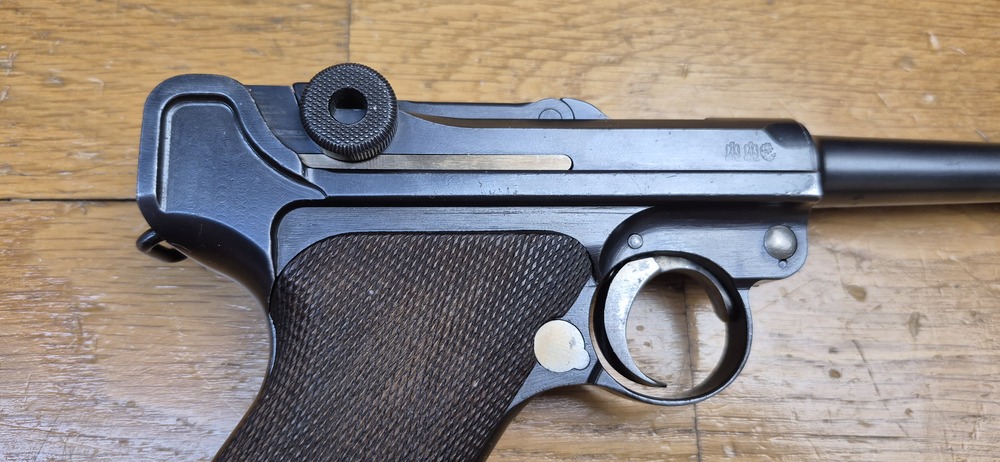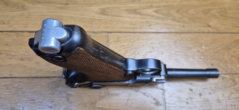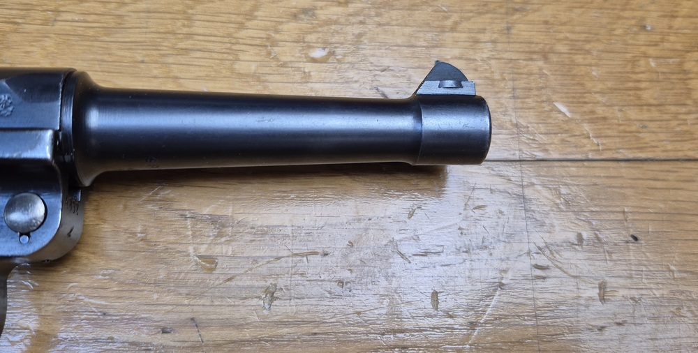 Les pièces bleutées d’origine (ressort de poussoir de chargeur, d’extracteur, ou axes de genouillère) le sont encore aussi. Très bel exemplaire.