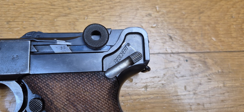 Et surtout notre exemplaire présente, en plus, une caractéristique peu courante, typiquement Police, typiquement III° Reich, et rare parmi dans tous modèles de Luger confondus : une sureté de gâchette Schiwy coté gauche en culasse.